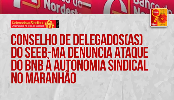 O Conselho de Delegados(as) Sindicais do SEEB-MA aprovou resolução denunciando a postura antissindical do Banco do Nordeste, que tem impedido a assinatura do Acordo de Autorregulação Sindical por parte do SEEB-MA e do SEEB-RN - acordo já firmado nacionalmente pela Contraf-CUT e outros sindicatos.
