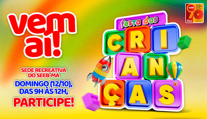 Olá, bancário(a)! Em comemoração ao Dia das Crianças, leve seus(suas) filho(as) para uma manhã de muita alegria no domingo (12/10), das 9h às 12h, na Sede Recreativa do SEEB-MA, no Turu.