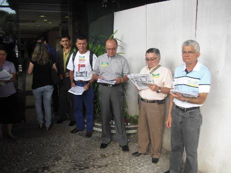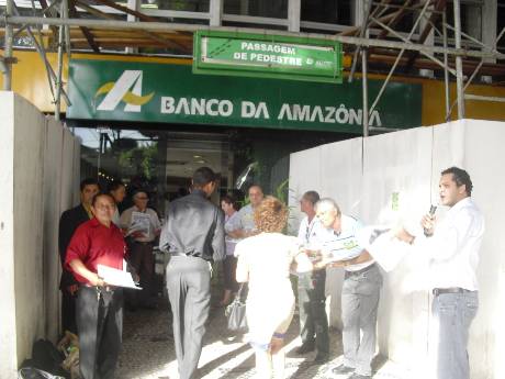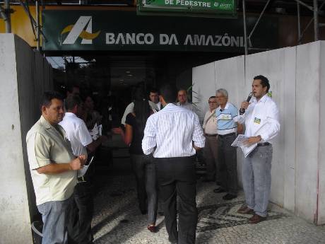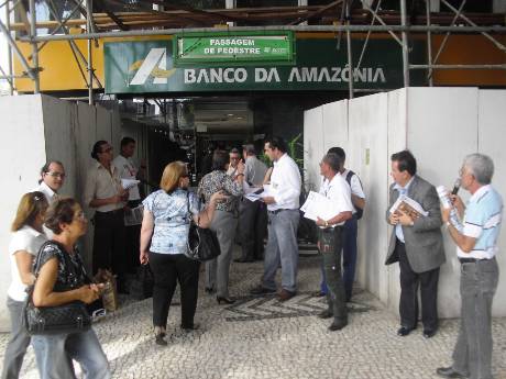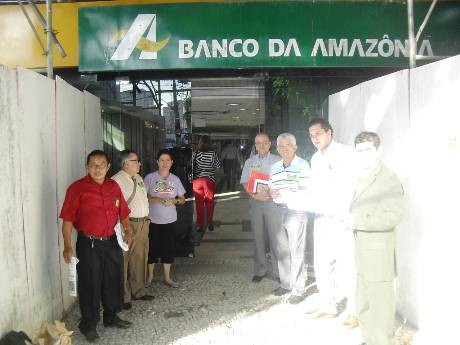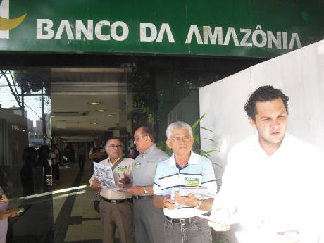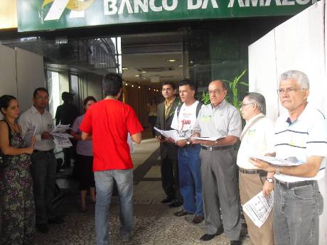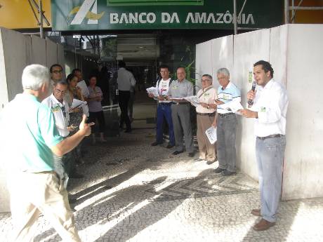 Representantes da Associação dos Aposentados do Banco da Amazônia (AABA), da Associação dos Empregados do Banco da Amazônia (AEBA) e do Sindicato dos Bancários do Maranhão (SEEB-MA) fizeram, na manha desta quinta-feira (08/08), em frente à matriz do Basa, em Belém, um protesto contra a milionária e assediadora campanha midiática realizada pelo banco com o objetivo de convencer empregados, aposentados e pensionistas da Capaf a migrarem para o perverso PSBD proposto pela instituição financeira.