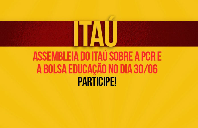 O SEEB-MA convida os bancários do Itaú para a Assembleia que será realizada na quarta-feira (30/06), a partir das 19h, pelo aplicativo Zoom (https://us02web.zoom.us/j/85036274946). O objetivo é deliberar sobre o Acordo de Participação Complementar nos Resultados (PCR) e sobre a Bolsa Educação. Bancário (a): participe. Sua presença é de fundamental importância.