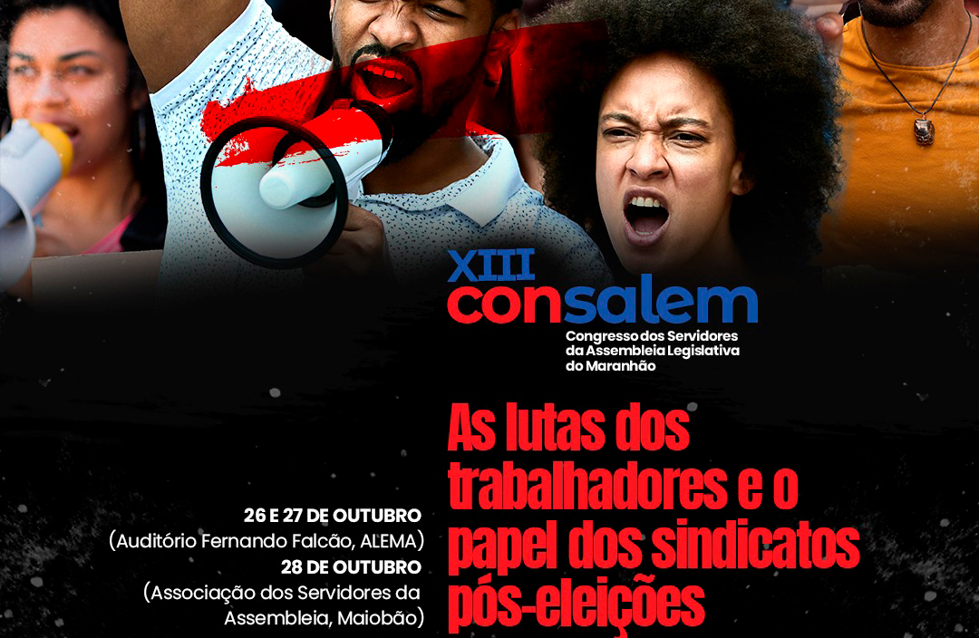 O SINDSALEM promoverá, nos dias 26 e 27 de outubro, a partir das 9h, o XIII Congresso dos Servidores da Assembleia Legislativa do Maranhão (Consalem).