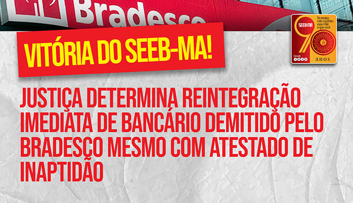 A Justiça do Trabalho de Imperatriz, em decisão proferida no dia 06/08, determinou a reintegração imediata de um bancário demitido pelo Bradesco, mesmo após os próprios médicos da instituição atestarem sua inaptidão para o trabalho devido a problemas de saúde.