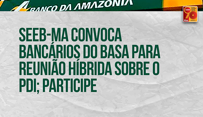O SEEB-MA convoca os bancários(as) do BASA para uma reunião híbrida sobre o Programa de Demissão Incentivada (PDI) lançado recentemente pelo banco. Na oportunidade, a assessoria jurídica do Sindicato esclarecerá as dúvidas dos(as) interessados(as).