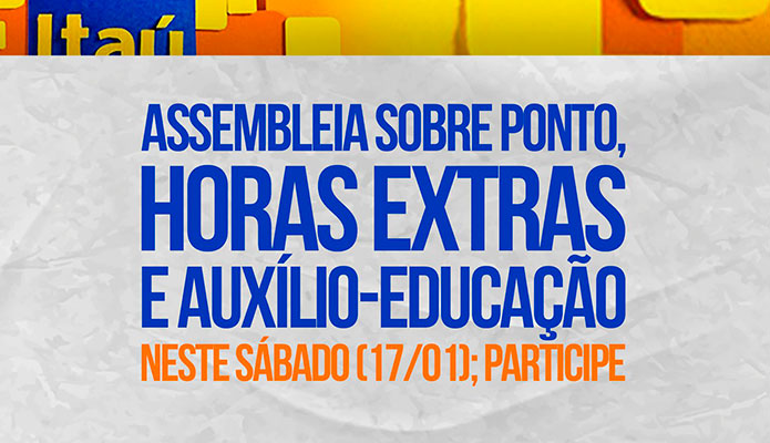 Na Assembleia, os(as) trabalhadores(as) vão deliberar acerca da proposta de Acordo Coletivo de Trabalho (ACT) apresentada pelo Itaú, que trata sobre ponto eletrônico, horas extras e auxílio-educação.