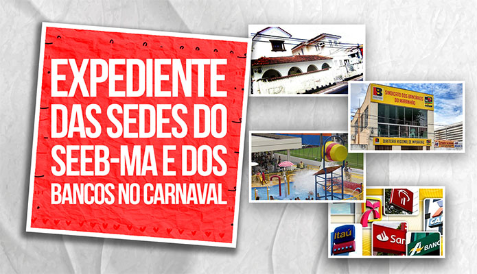 A Diretoria do SEEB-MA informa que não haverá expediente nas Sedes Administrativas do Sindicato, em São Luís e em Imperatriz, nos dias 16/02 e 17/02 (segunda e terça-feira de Carnaval). Já no dia 18/02 (Quarta-Feira de Cinzas), o Sindicato voltará a funcionar a partir do meio-dia (12h).